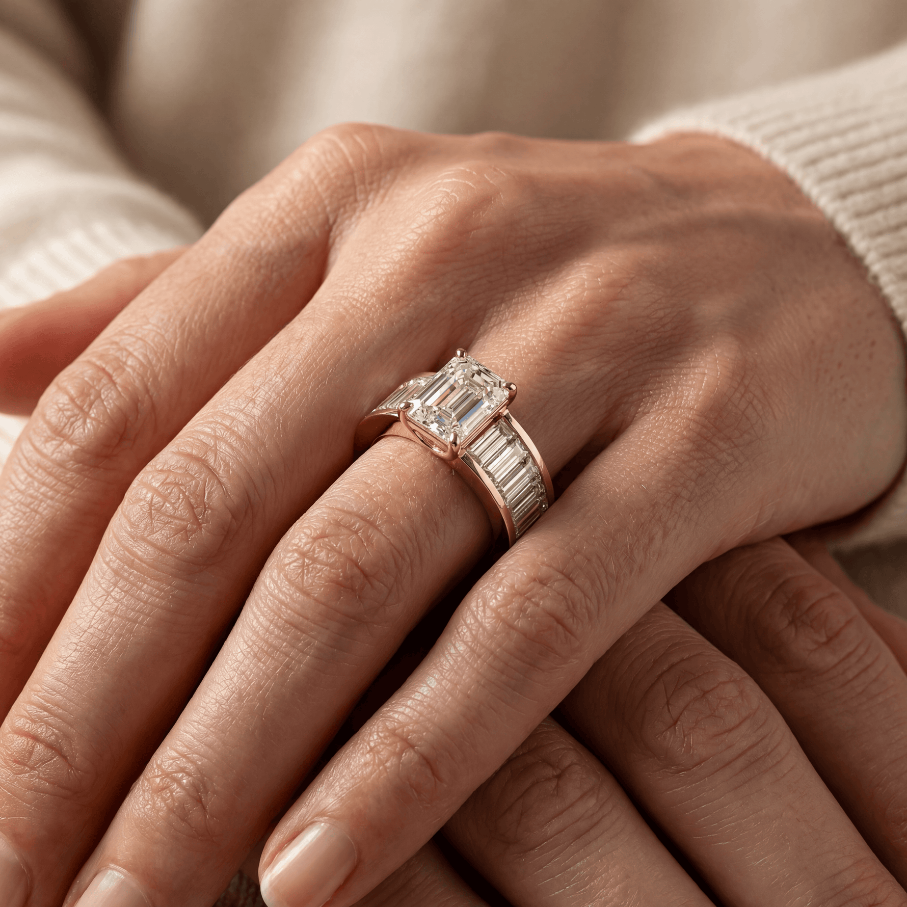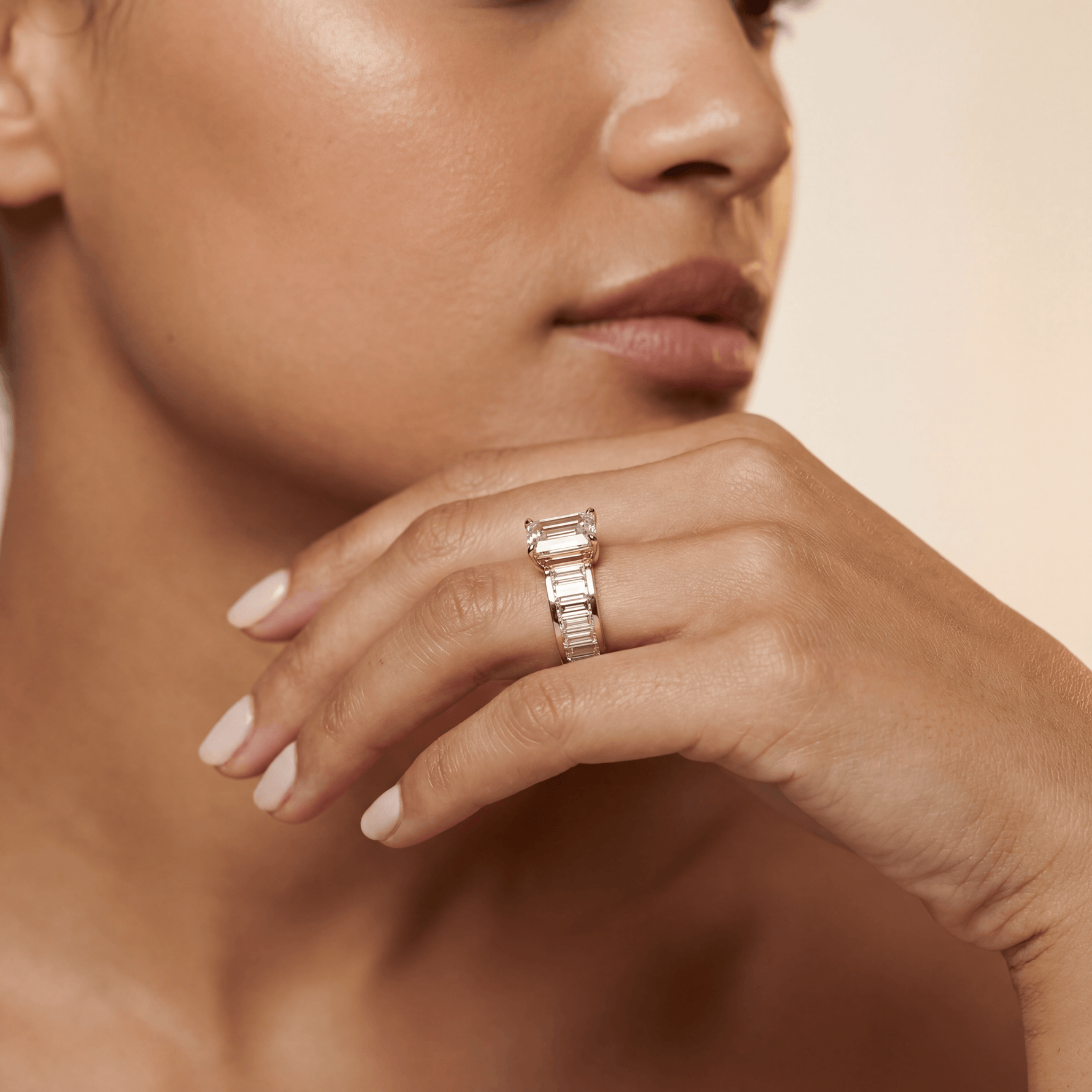 Emerald Art Deco with gallery rail. Low-profile design sits closer to the finger with unique geometric detailing. The straight lines highlight the emerald stones in a refined way.