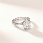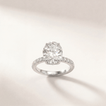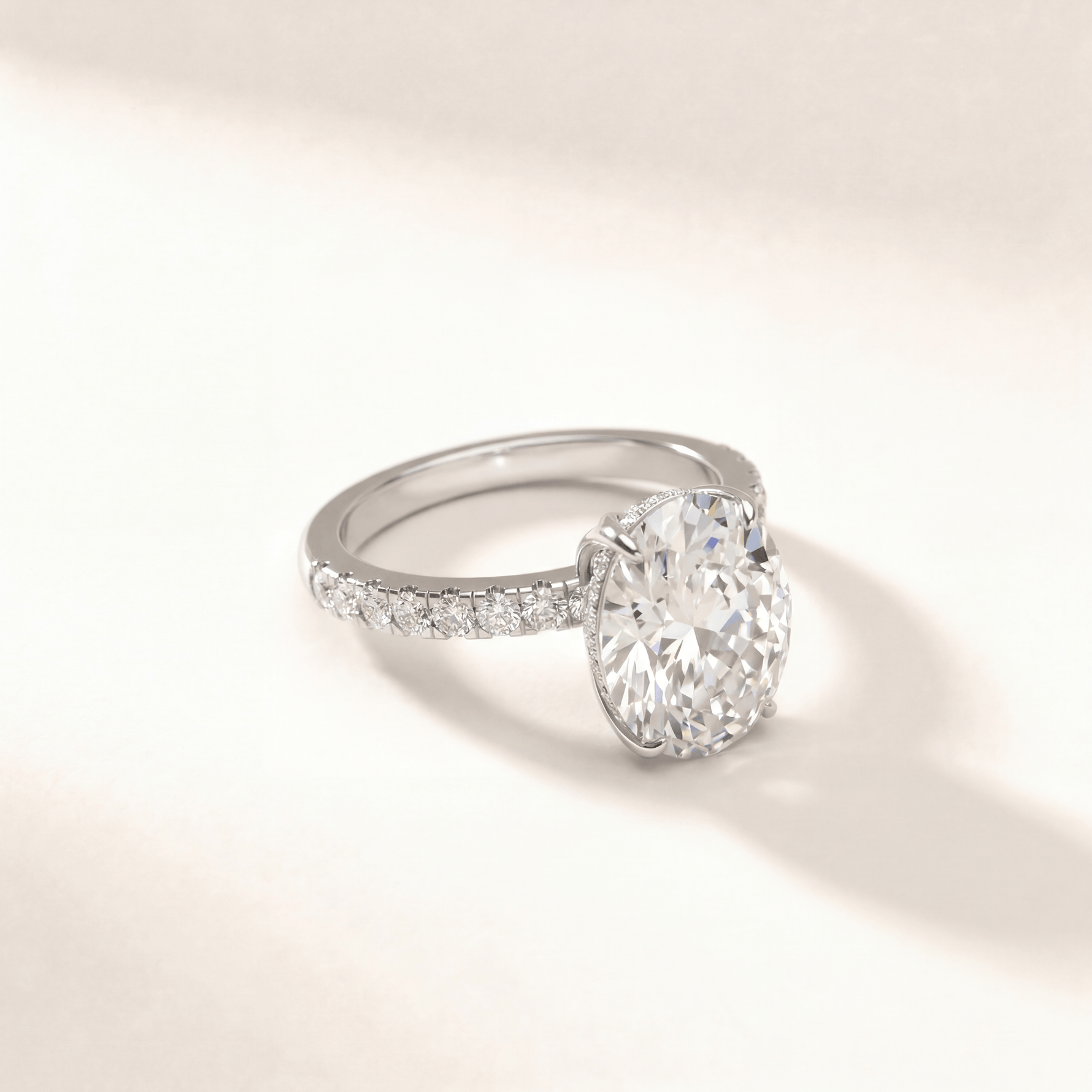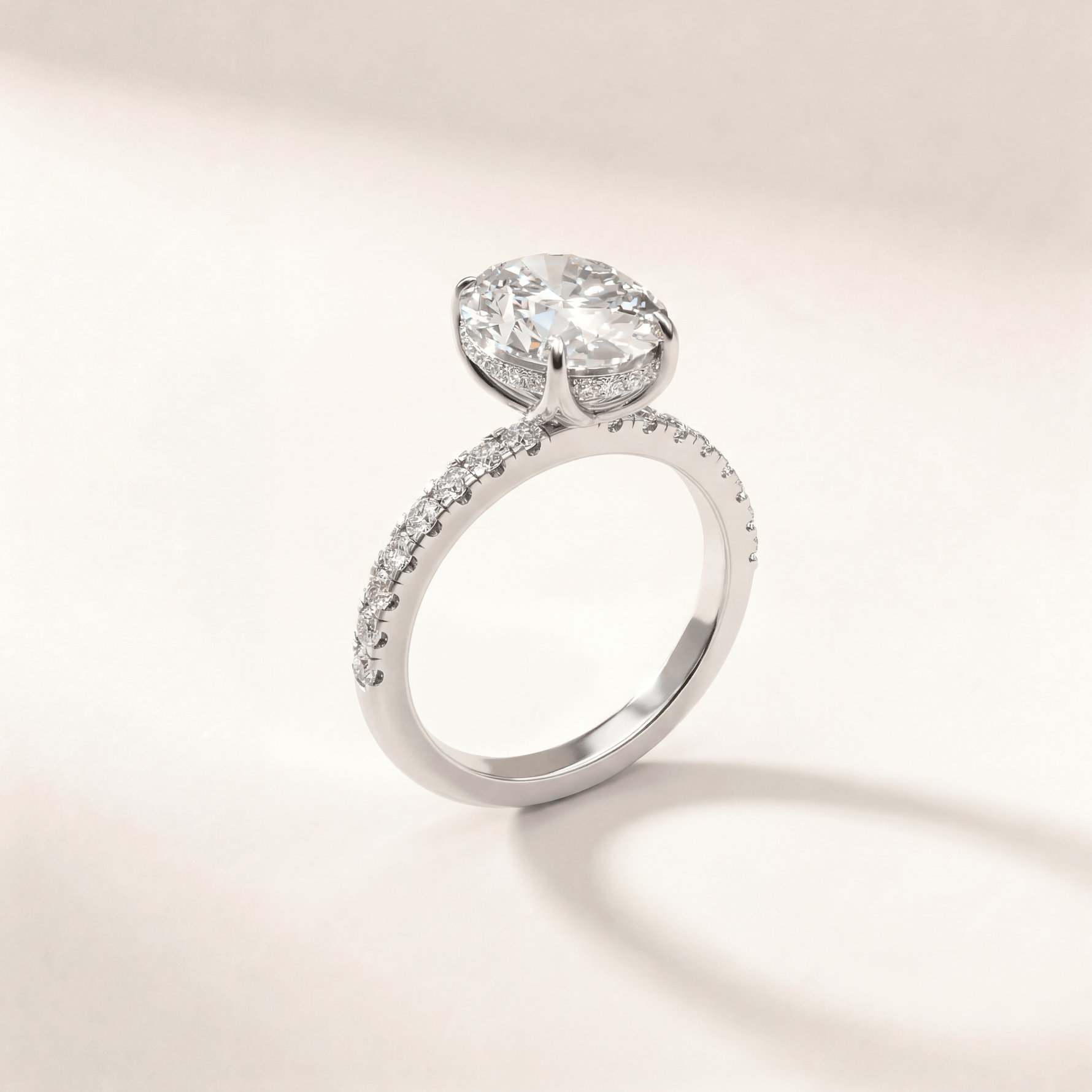Four-petal tulip pave classic oval. Pave along the band adds delicate shimmer. Halo frames the petals softly.