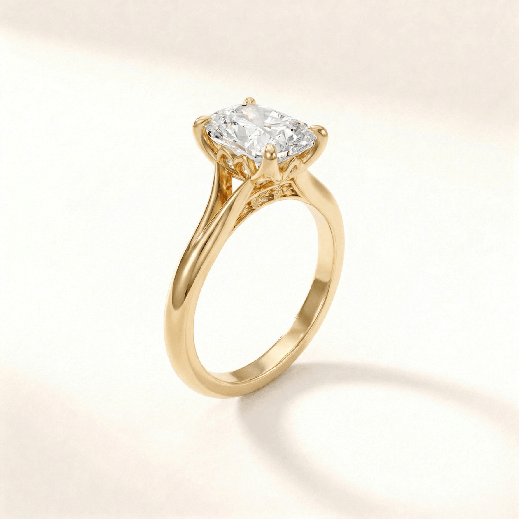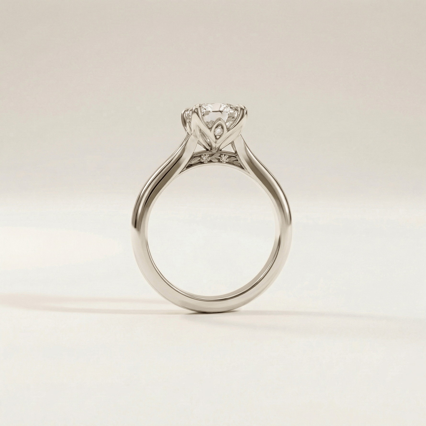 Half tulip cushion with an engraved band. The floral setting gently holds the center stone while vintage-style engraving adds texture and character. A perfect blend of delicate details and strong proportions.