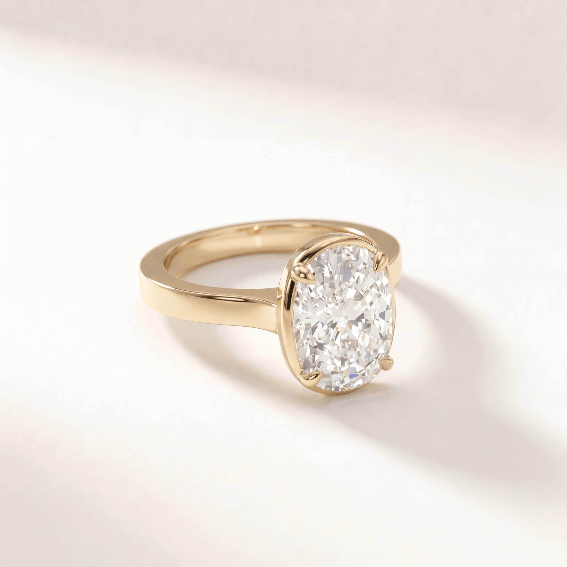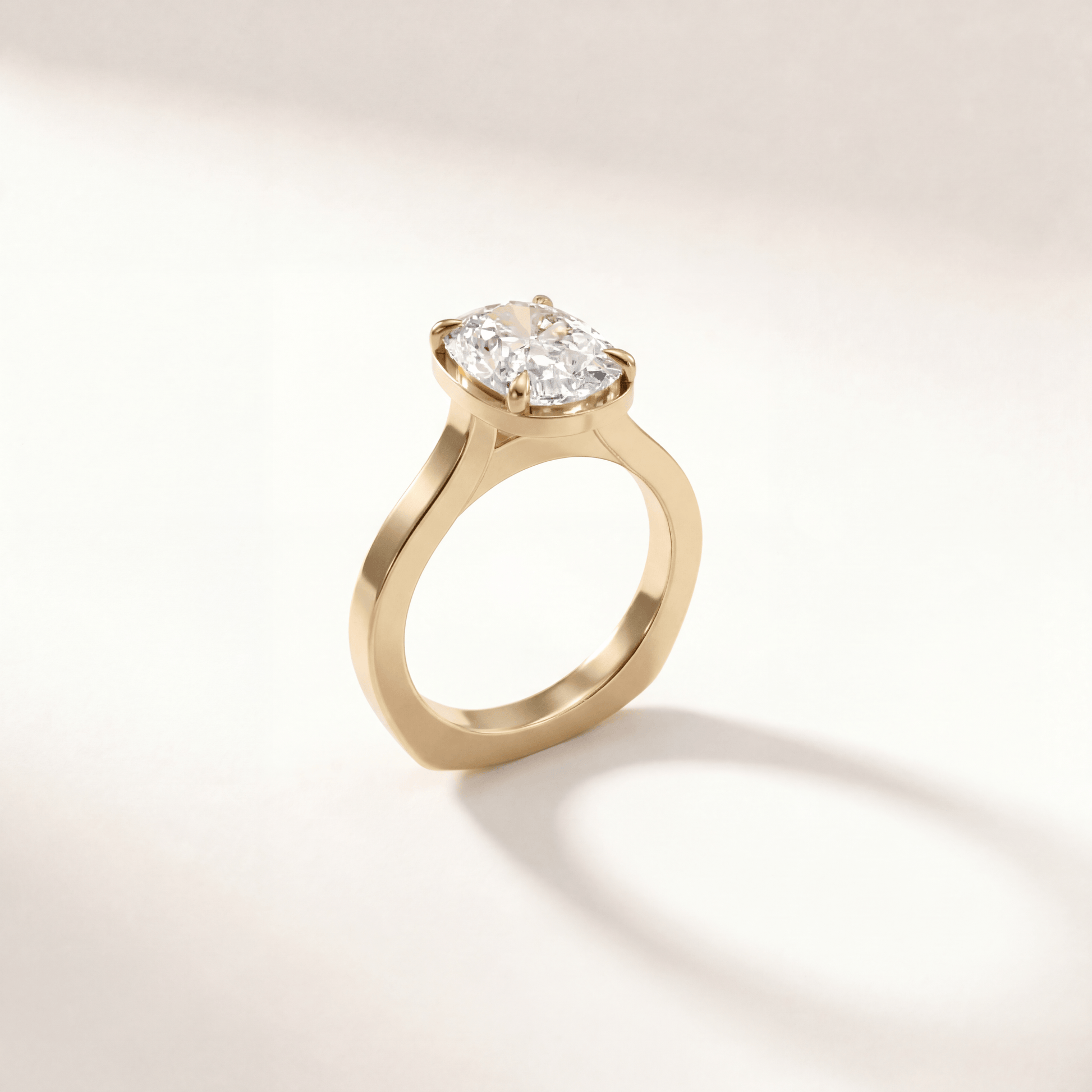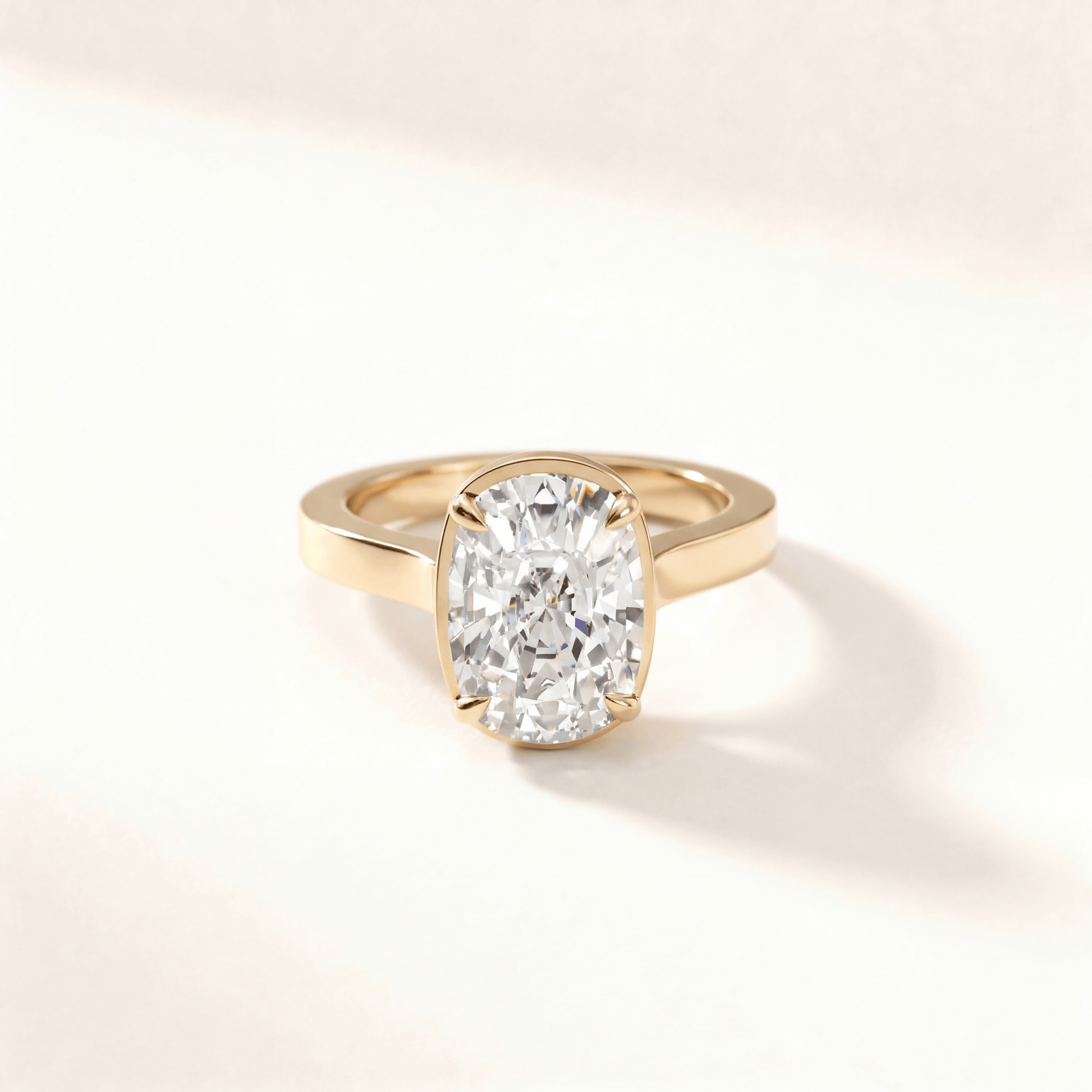 Four-prong cushion with a gallery rail that is slightly visible from the top. Cathedral setting adds height and elegance without being too flashy.