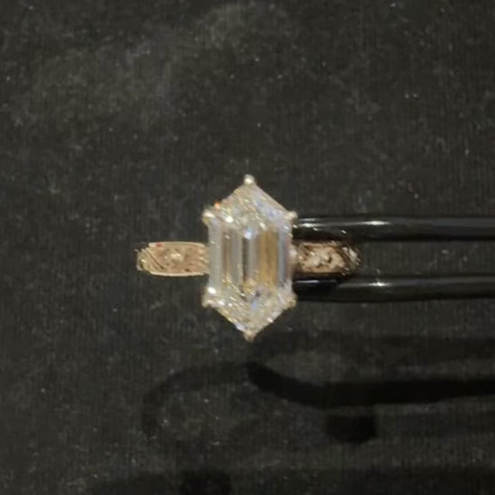 This ring features a 2.5CT Dutch marquise center stone, set in a 14K yellow gold 3mm band with claw prongs. Custom hand engraving details the top of the band, the gallery rail, and the bridge.