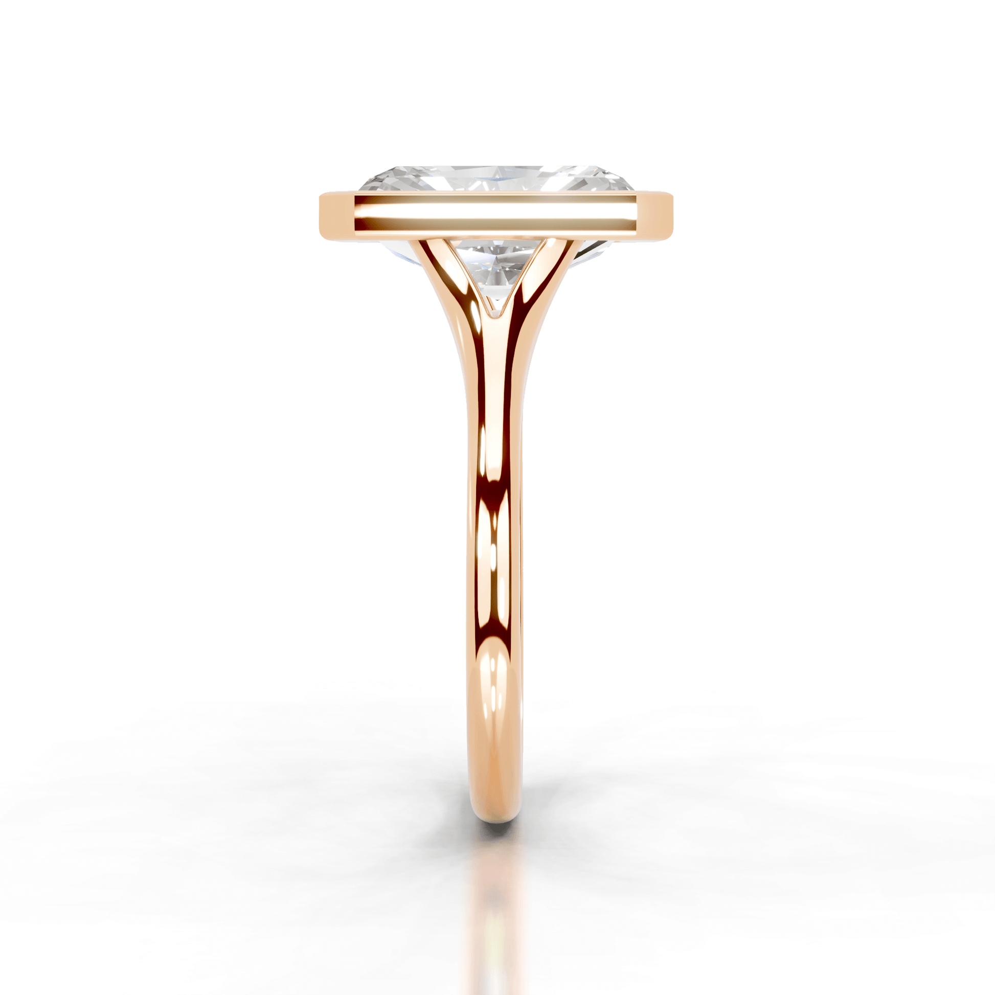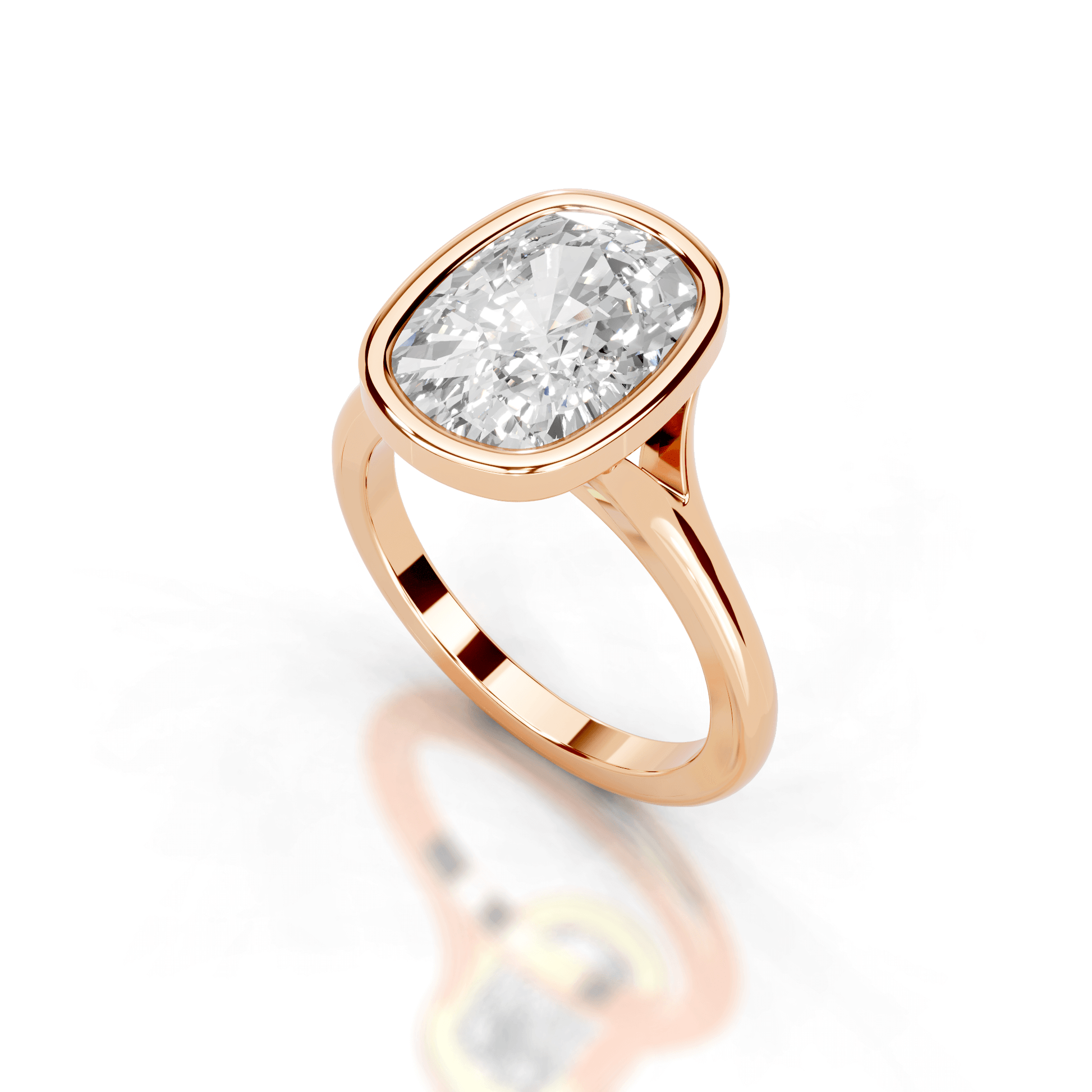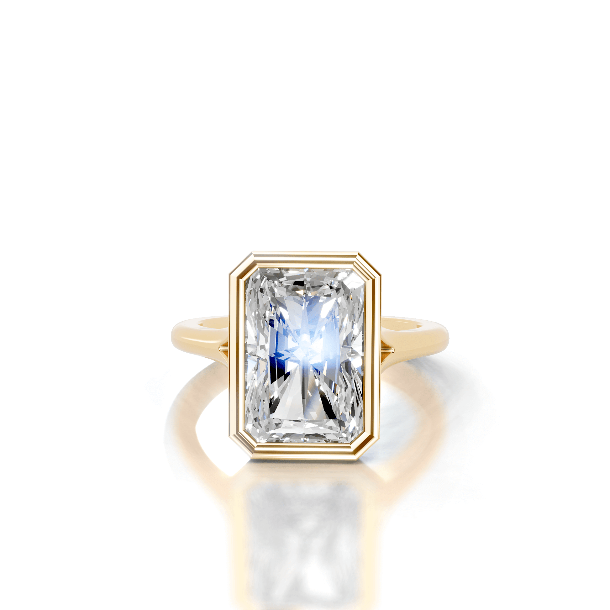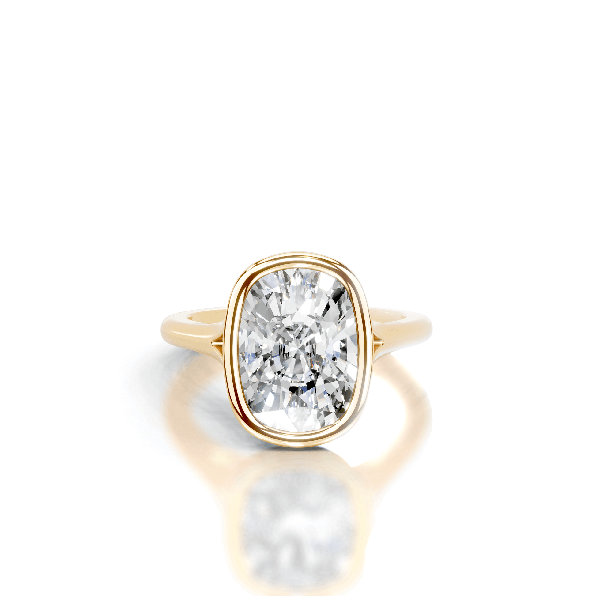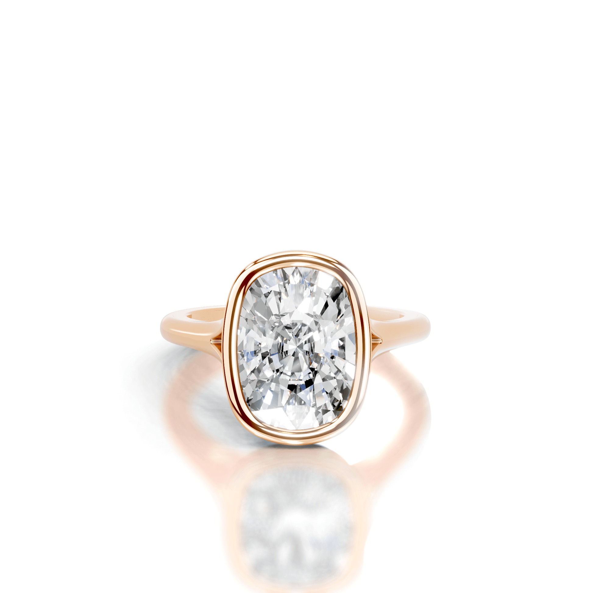 The split shank frames the diamond in an invisible full bezel setting, giving it a modern yet structured look. The 2 mm band is light and comfortable. The ring is a mid-profile setting that lets the diamond sit just above the band for a wedding band to stack flush for a clean pairing.