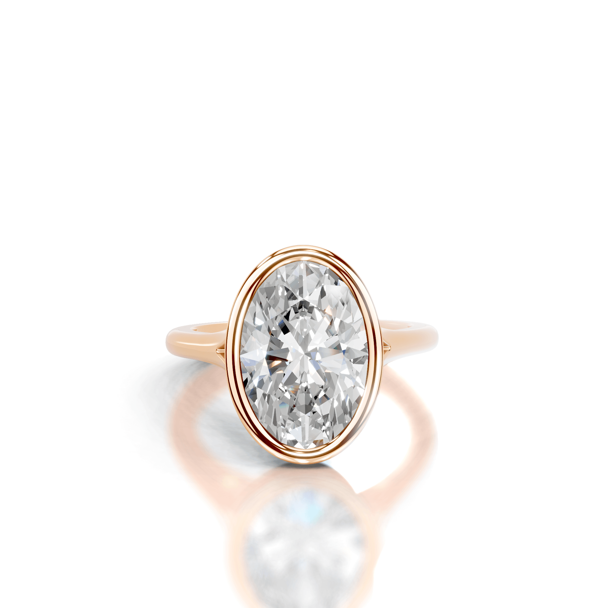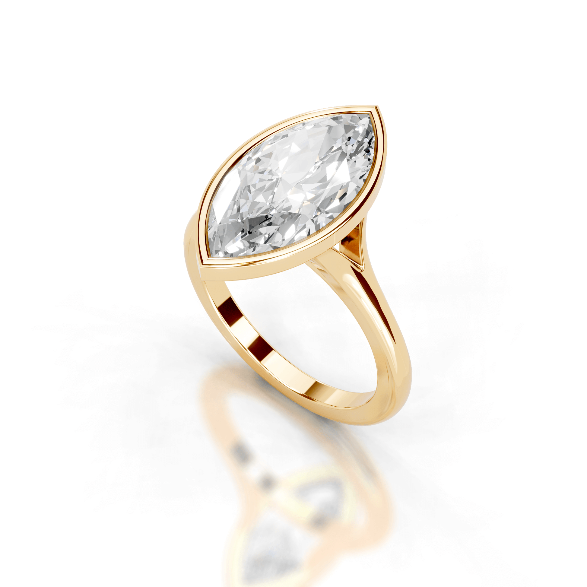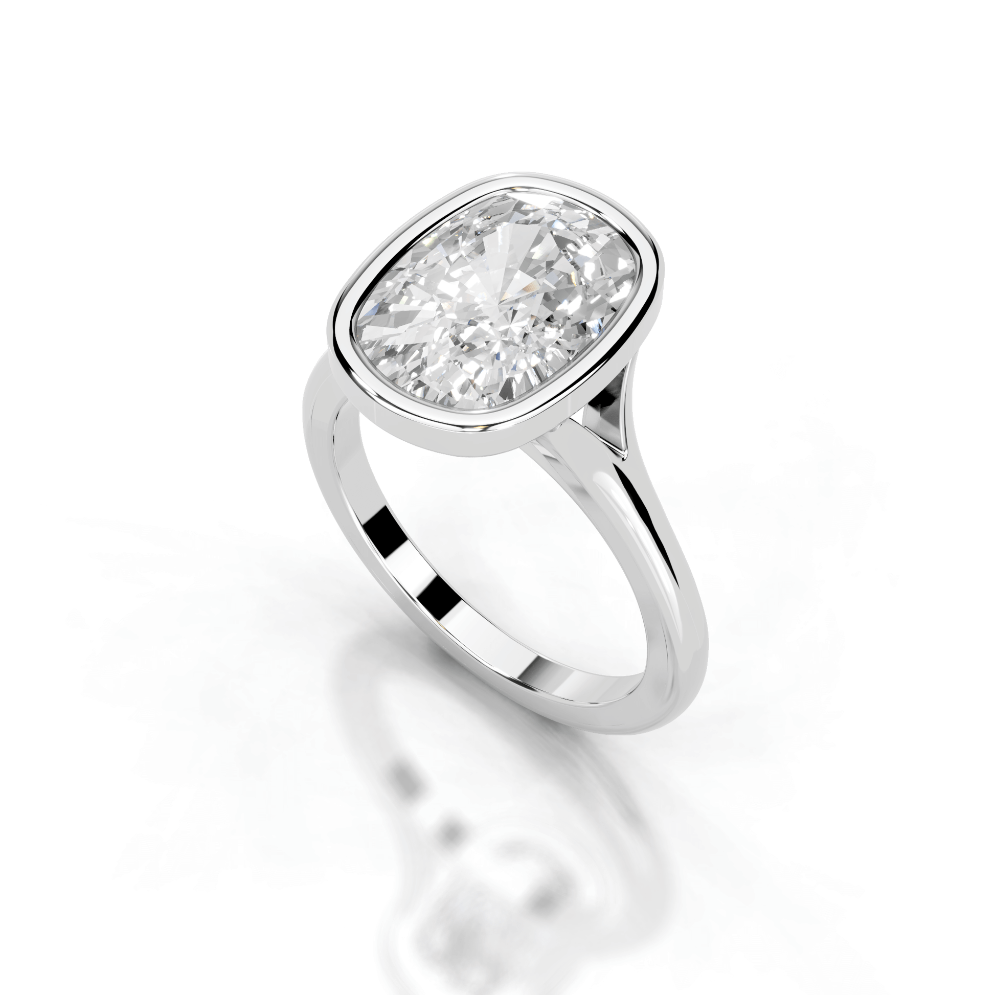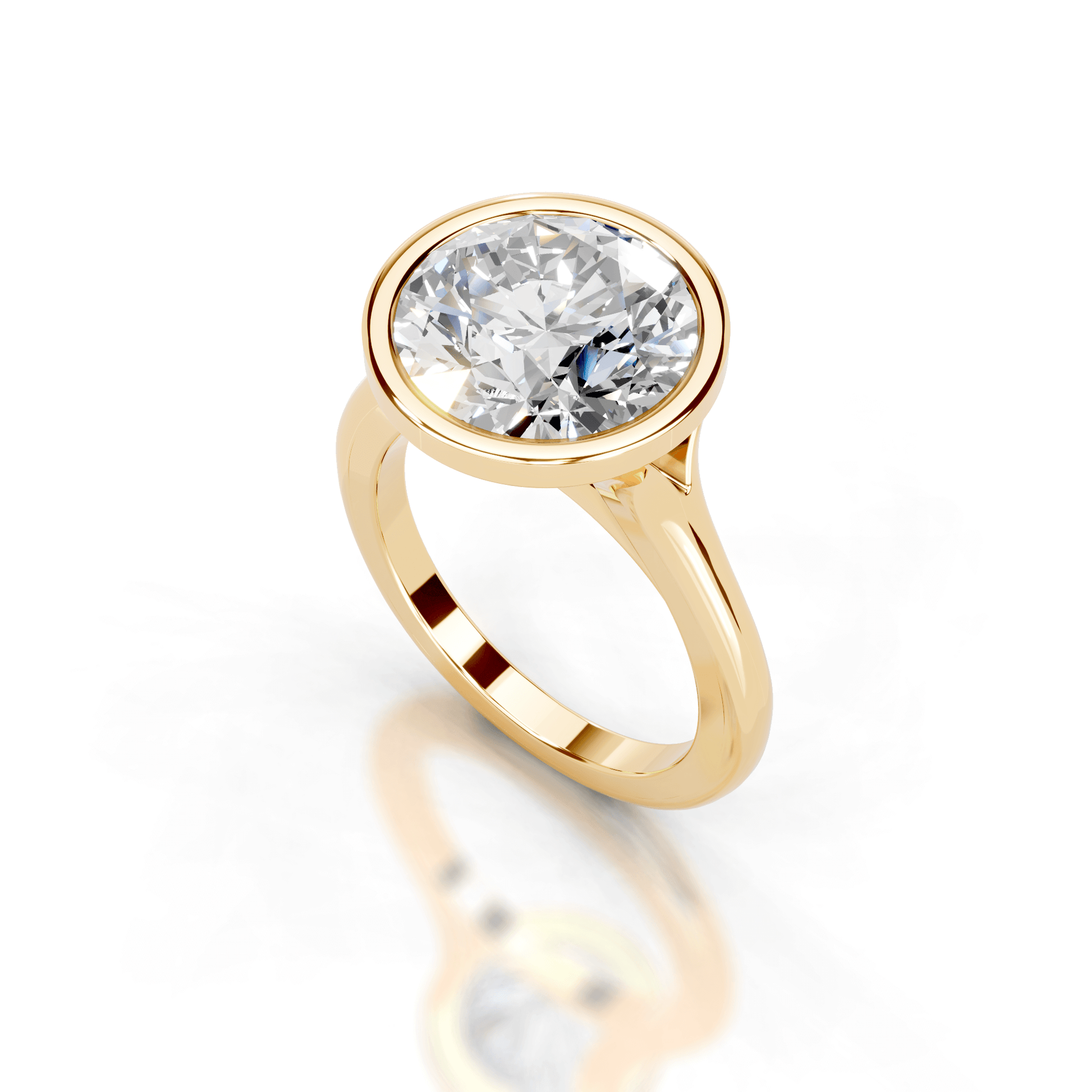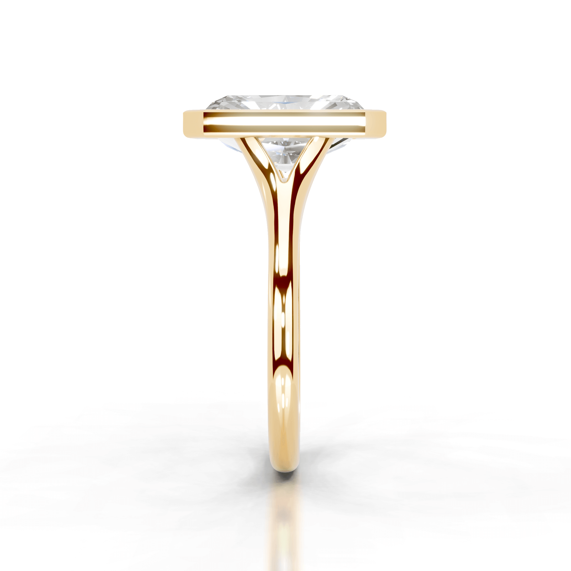 The split shank frames the diamond in an invisible full bezel setting, giving it a modern yet structured look. The 2 mm band is light and comfortable. The ring is a mid-profile setting that lets the diamond sit just above the band for a wedding band to stack flush for a clean pairing.