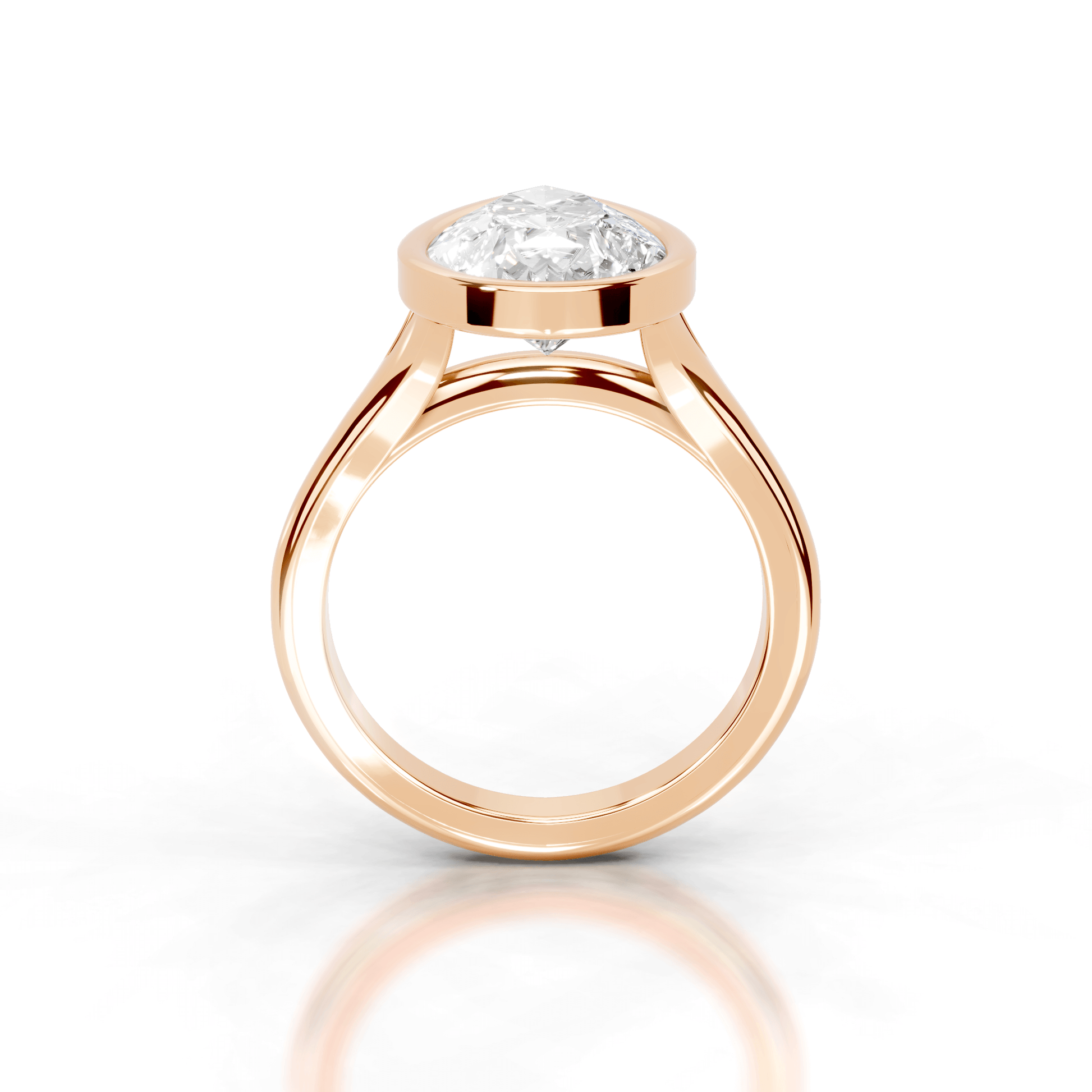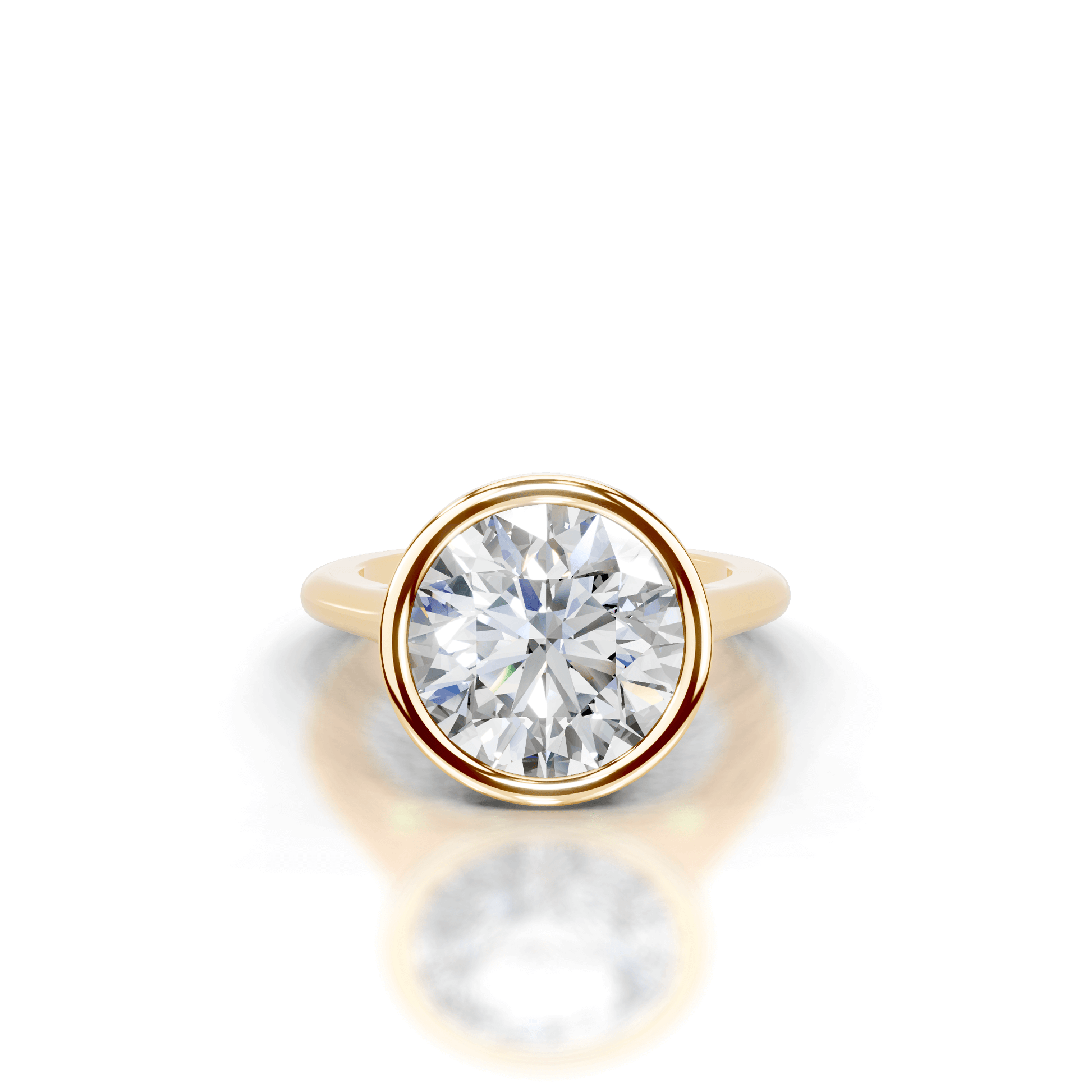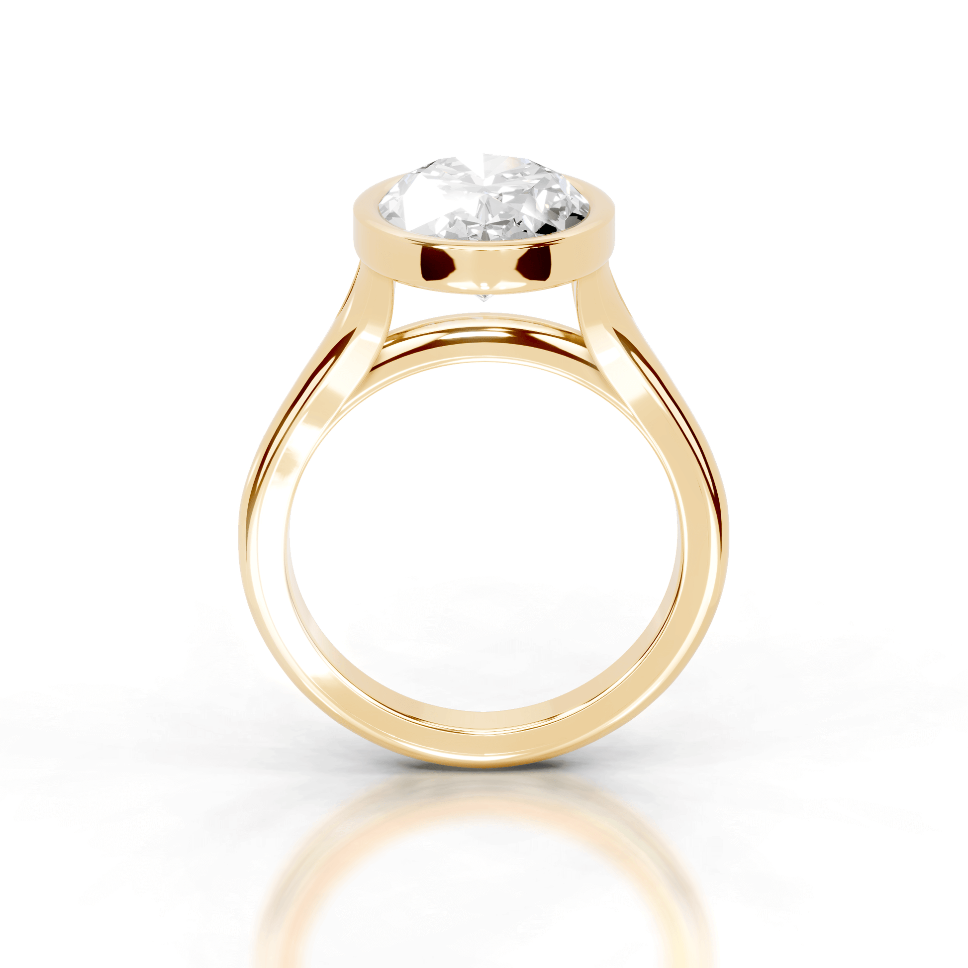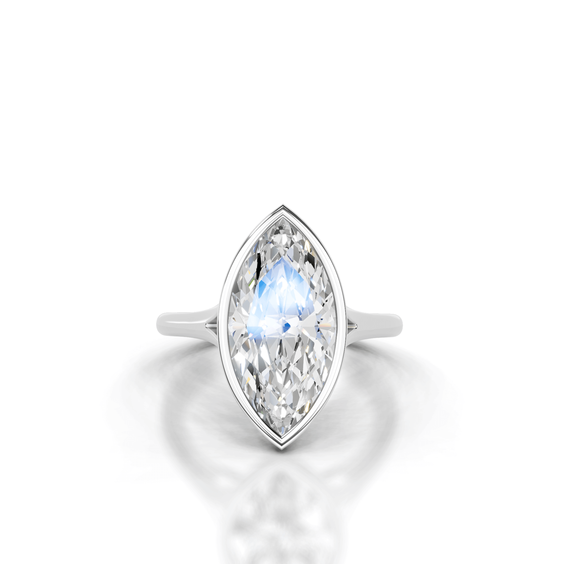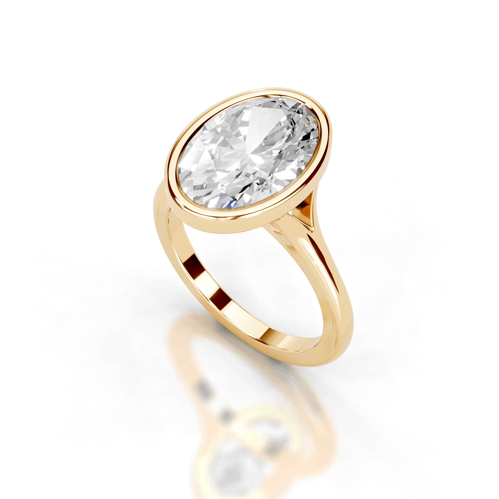 The split shank frames the diamond in an invisible full bezel setting, giving it a modern yet structured look. The 2 mm band is light and comfortable. The ring is a mid-profile setting that lets the diamond sit just above the band for a wedding band to stack flush for a clean pairing.
