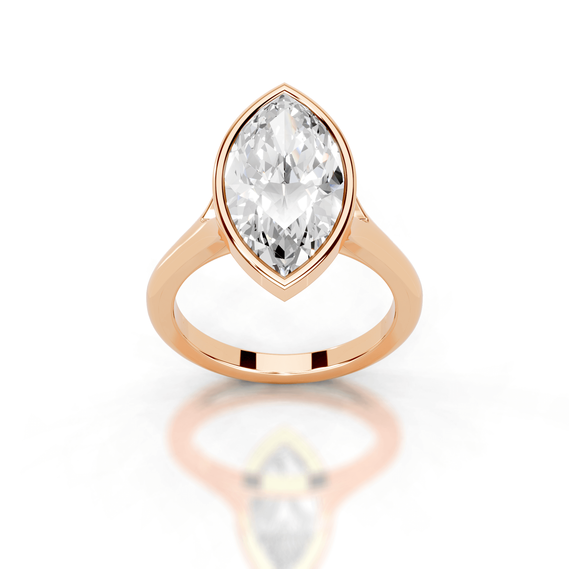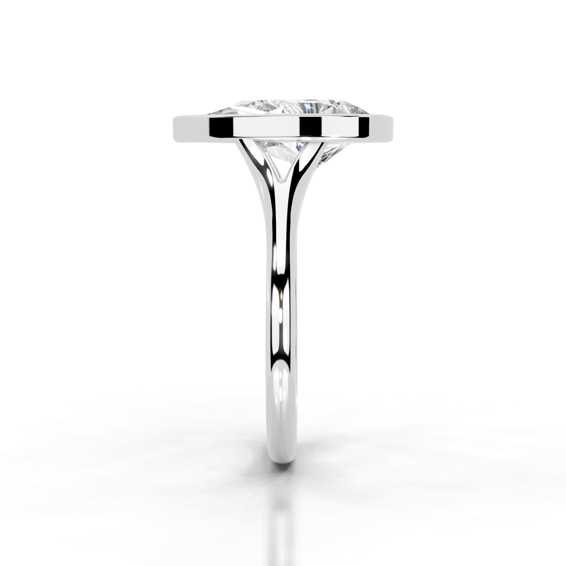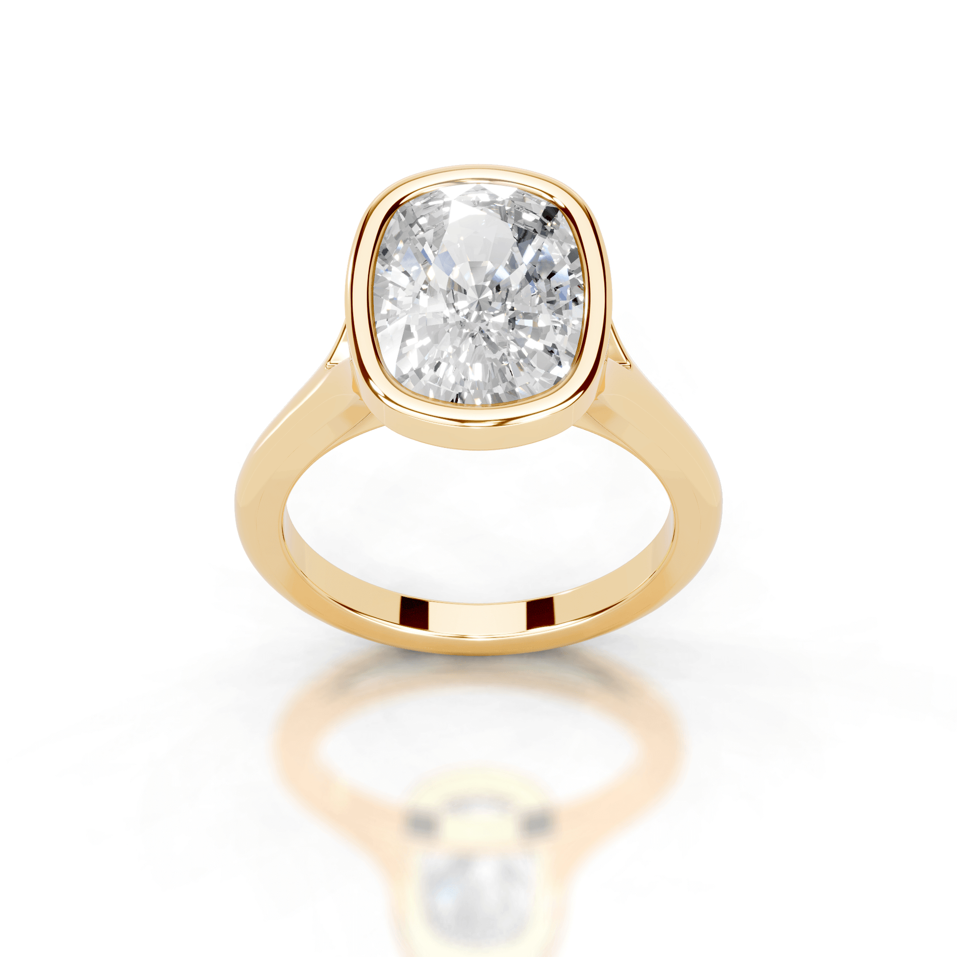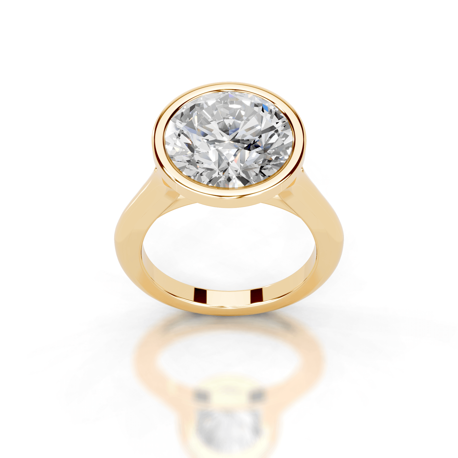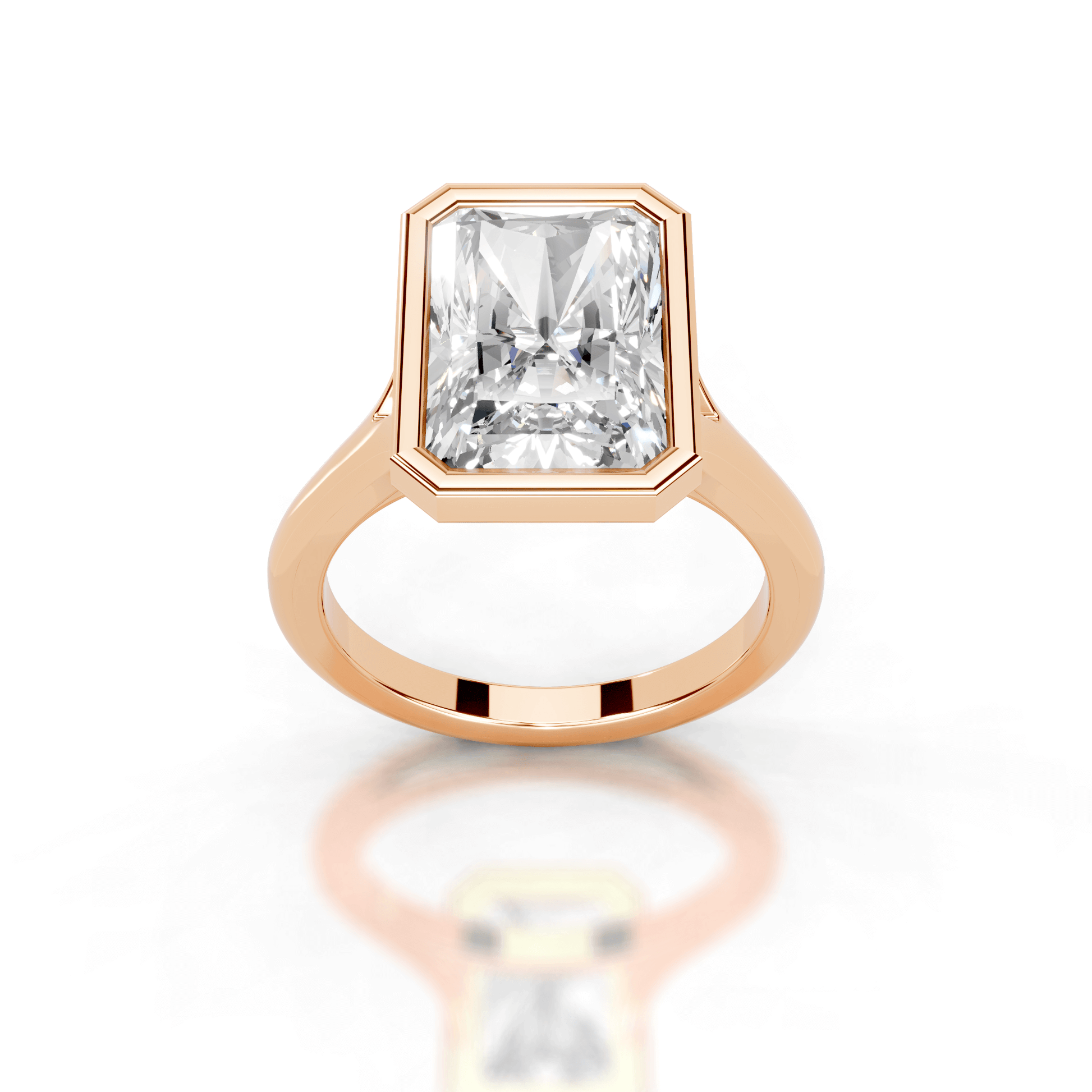 The split shank frames the diamond in an invisible full bezel setting, giving it a modern yet structured look. The 2 mm band is light and comfortable. The ring is a mid-profile setting that lets the diamond sit just above the band for a wedding band to stack flush for a clean pairing.
