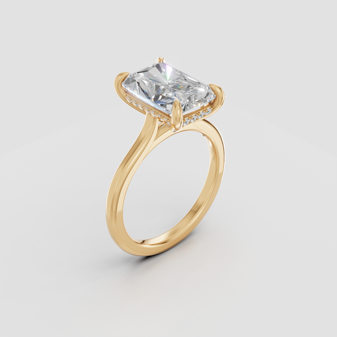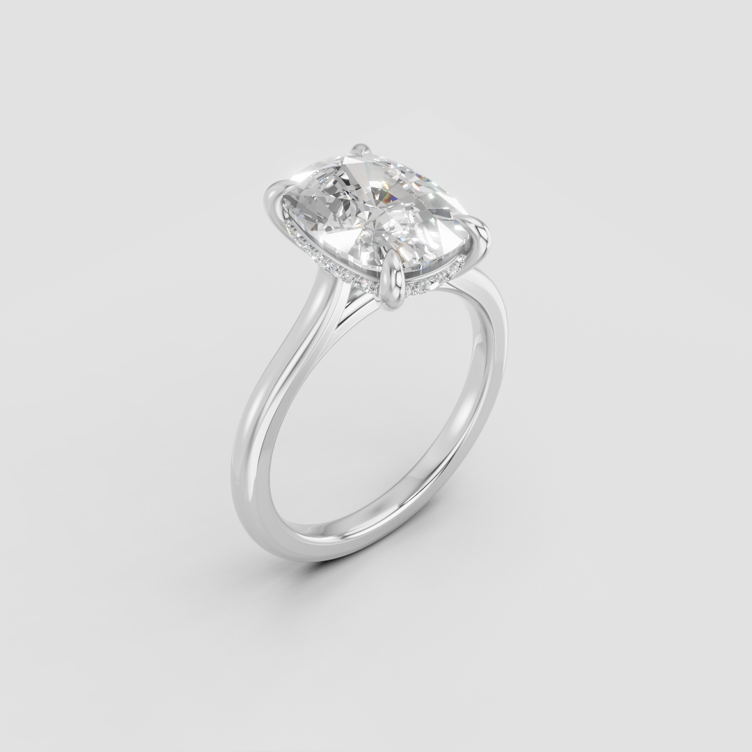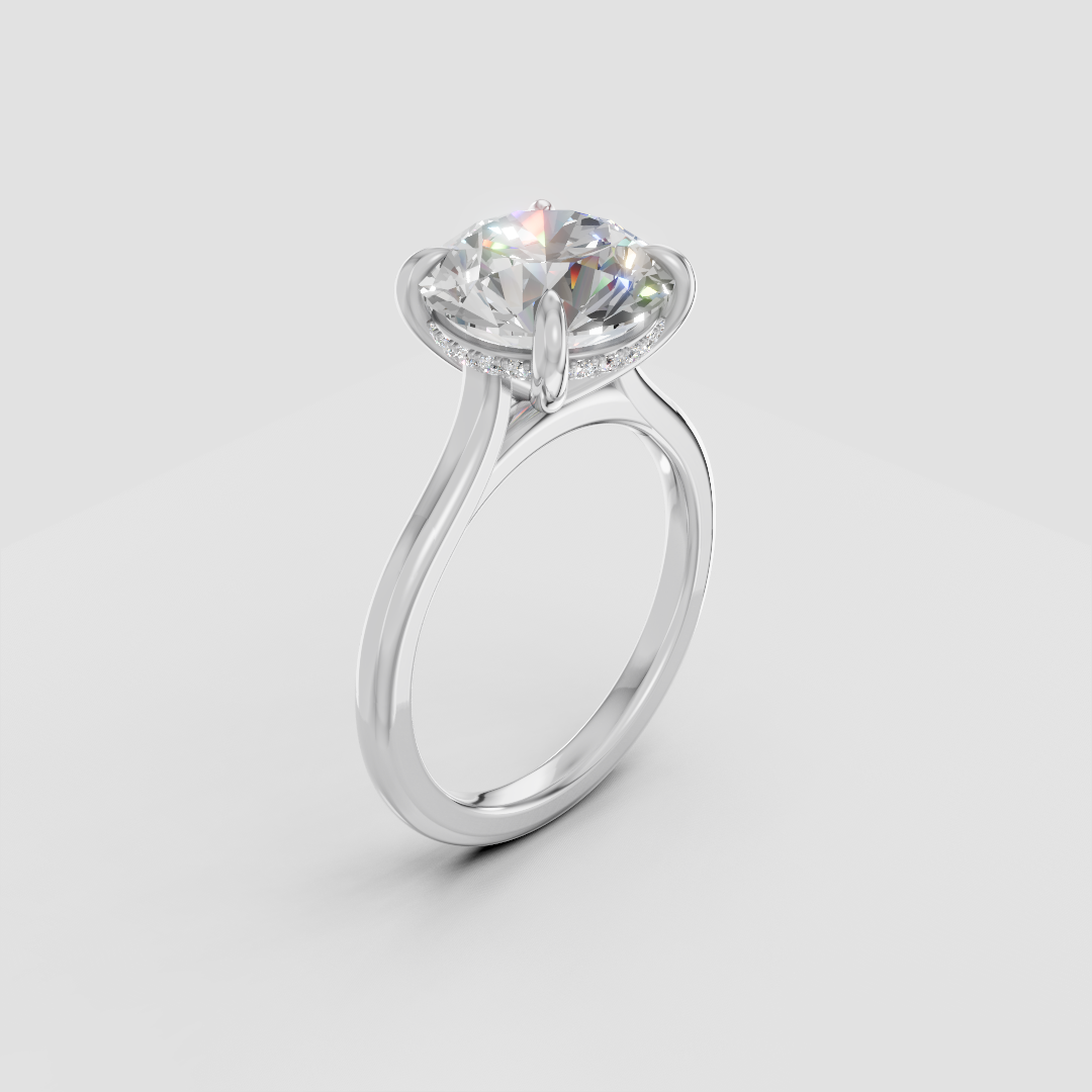 Hidden halo setting with petit claw prongs and 2mm in a classic band setting for a balanced, delicate look. Each of our rings are hand crafted in Toronto.