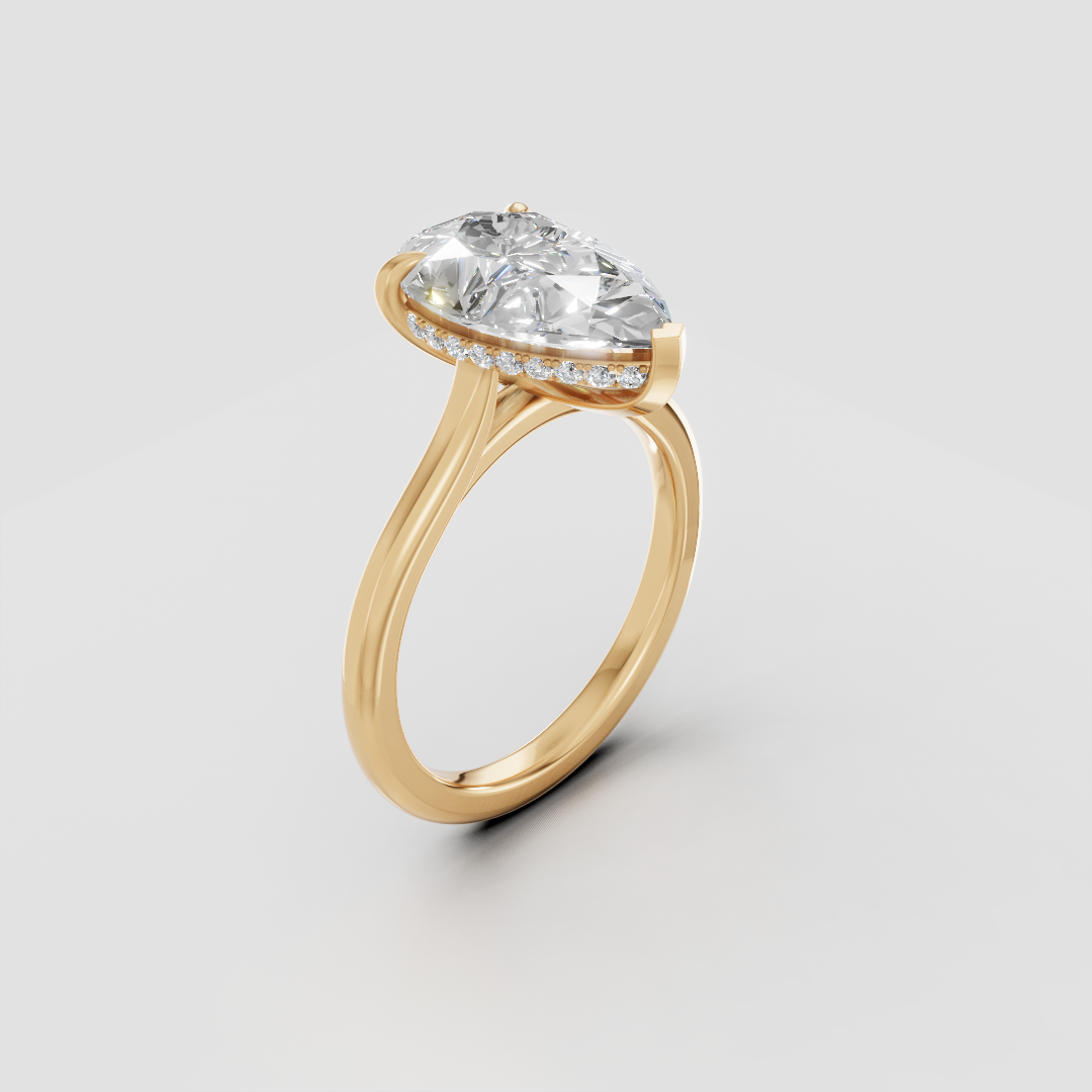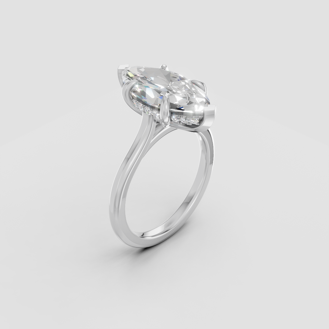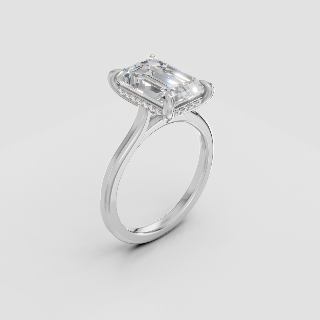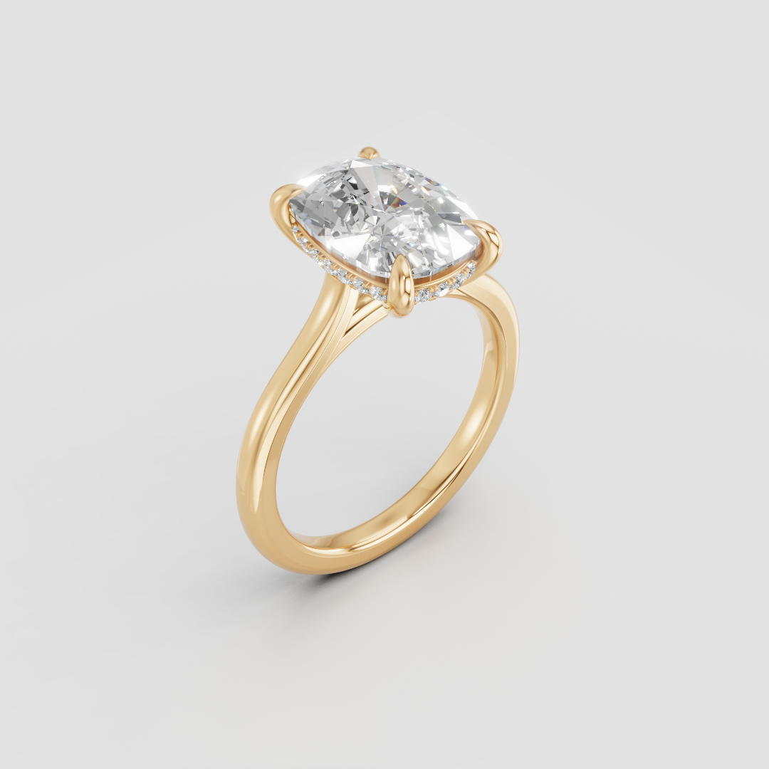 Hidden halo setting with petit claw prongs and 2mm in a classic band setting for a balanced, delicate look. Each of our rings are hand crafted in Toronto.