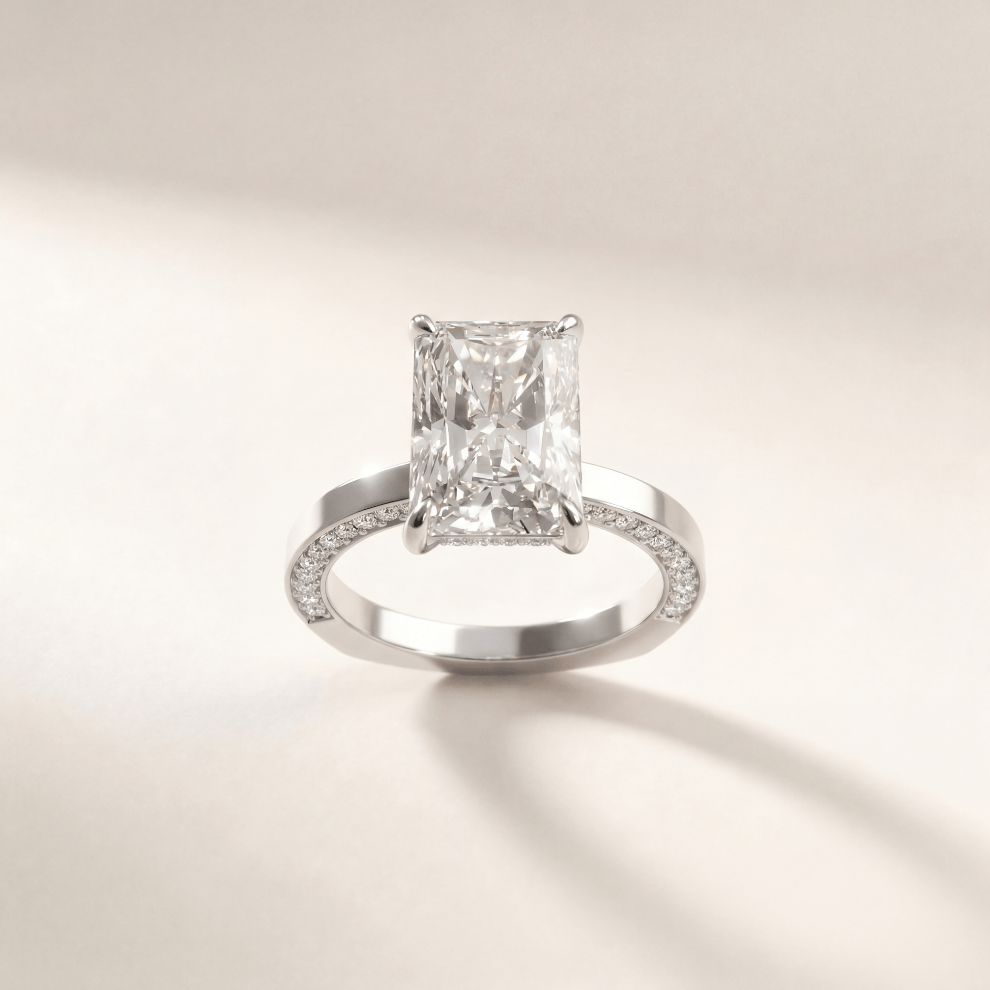 Hidden diamonds radiant. Hidden pave along the halo gives subtle shimmer. Euroshank helps keep it stable on the hand.