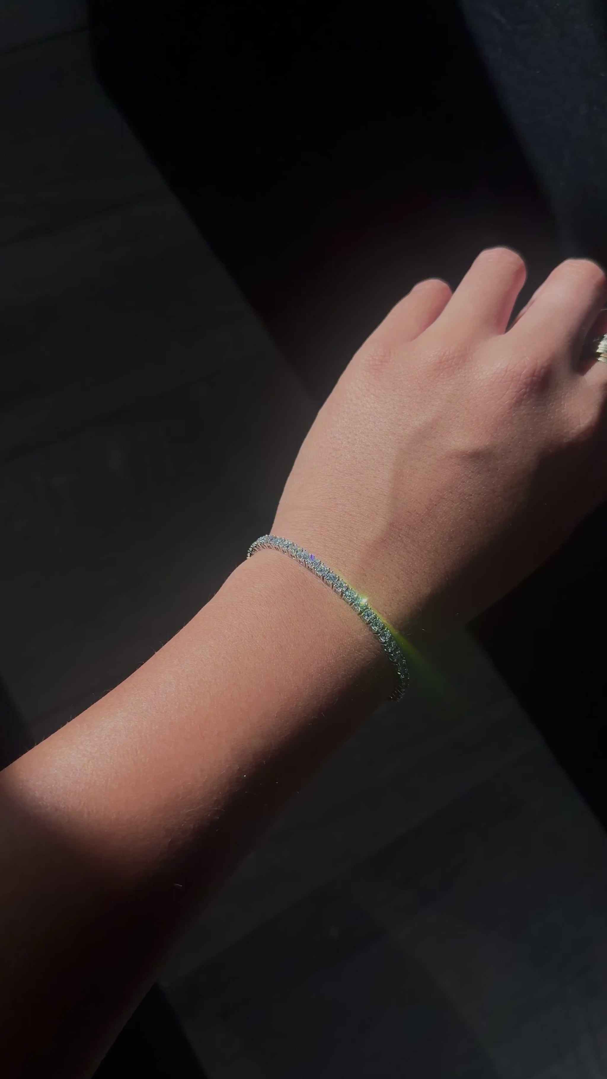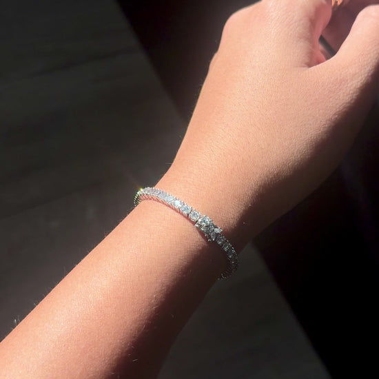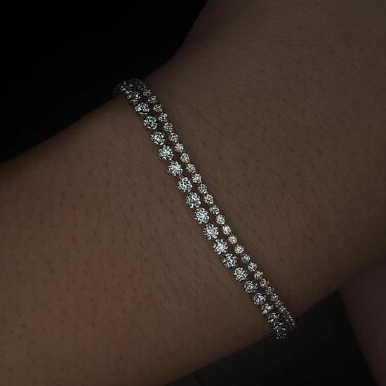 A classic 4-prong tennis bracelet of round diamonds, accented with a marquise diamond flower at the clasp and secured with butterfly double clasps for extra security.